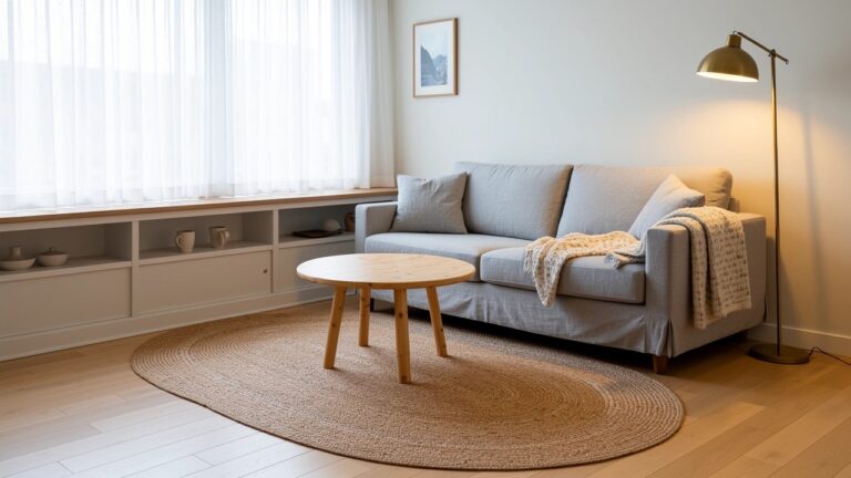 Try a low round table in light oak tones to match floors or shelves. Put it on a seagrass rug to define the seating spot. This works great in apartments or smaller homes… just don’t overload the table. Keep the top clear for coffee or books.